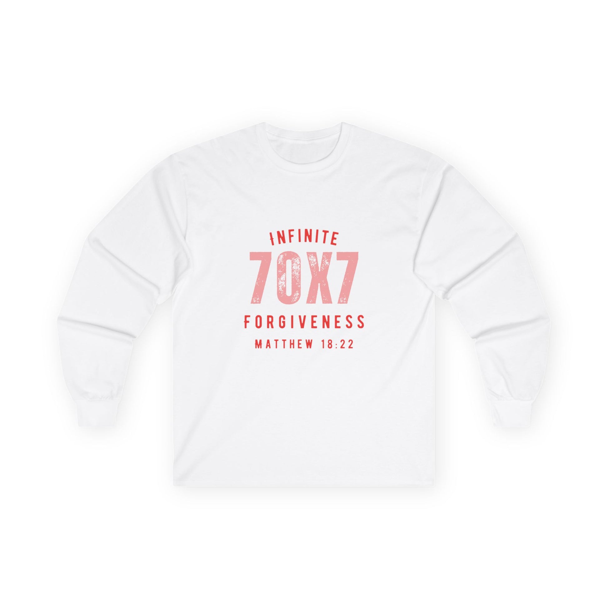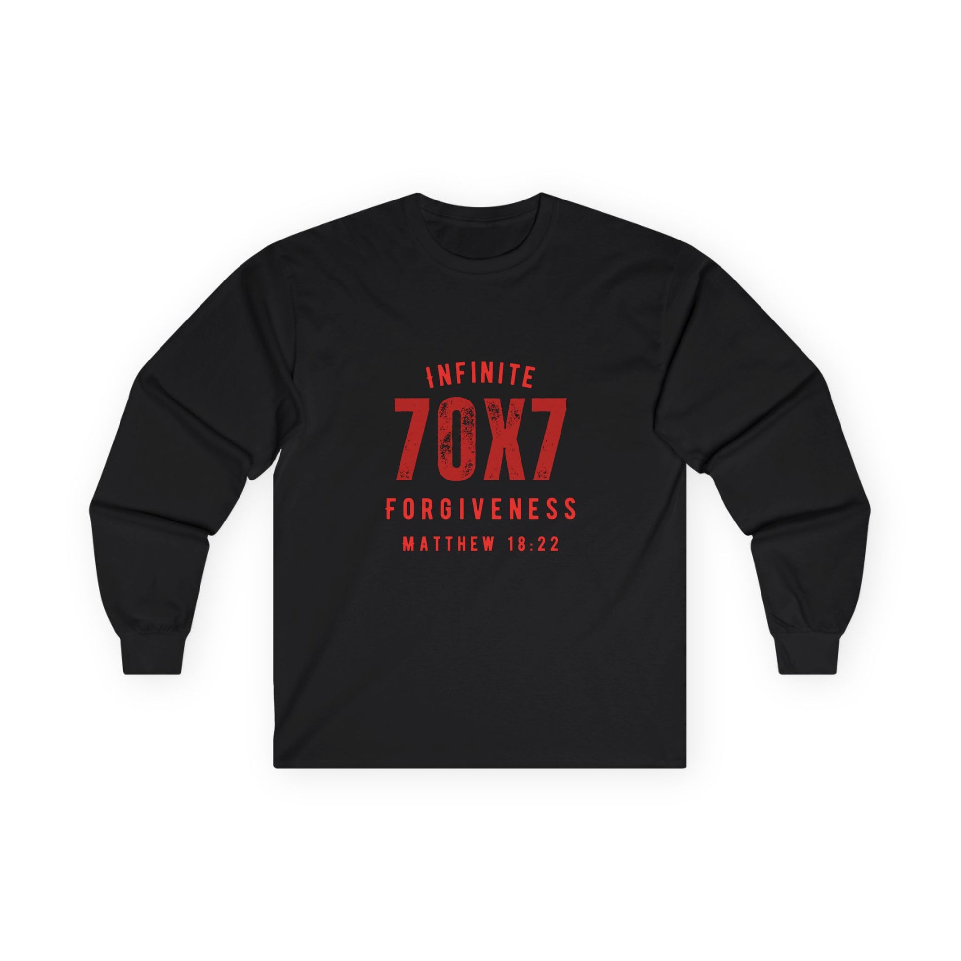 Stay comfy and stylish in these Infinite Forgiveness Long Sleeve T Shirt featuring a Christian-inspired design inspired by Matthew 18:22. This shirt is perfect for casual days or working out, giving off a cool and athletic vibe. Ideal for anyone looking for a motivational apparel piece.